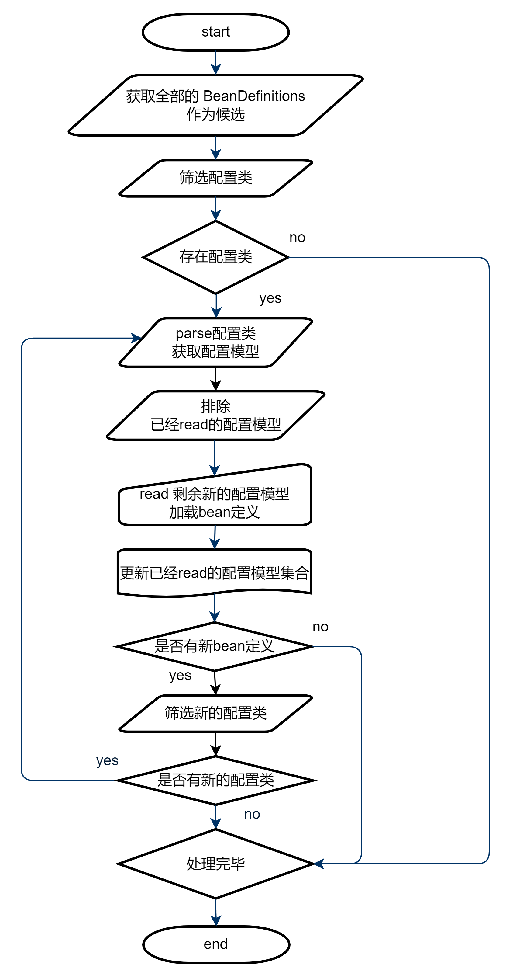 新的 BeanDefinitions 可能有新的配置类,回到 1 再来一遍。重复循环直到不再引入新的配置类。